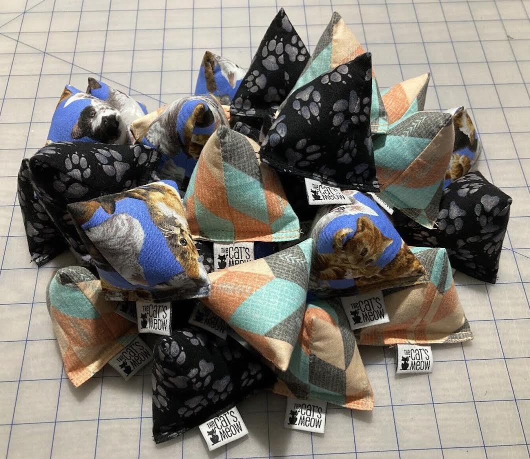 Cats will love these Krazy Kitty Pyramid Cushion toys. Contains a unique mixture of organic catnip, honeysuckle, valerian, and catmint herbs. This cushion is perfect for hugging, kicking, biting, batting around, and using as a pillow when playtime is over. Comes in a variety of designs; please allow us to choose one for you! Each side is 3". 6 toys in package. Warning: Our play toys of any kind should always be used under supervision. Do not allow your pet to chew and/or swallow portions of any toy. Remove if you see any signs of deterioration and replace with a new toy. Keep out of reach of children, our products are meant for pets only.