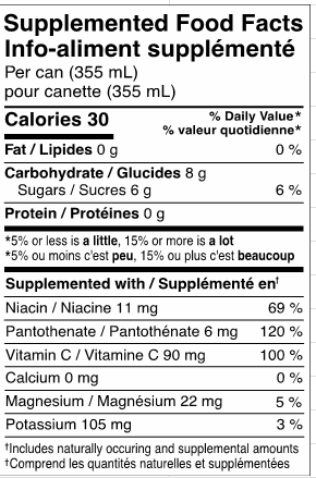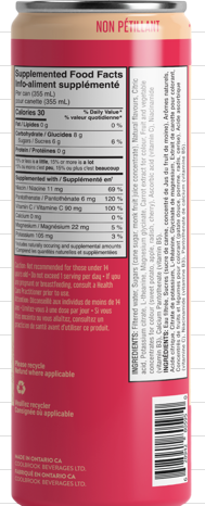 | Filtered water, Sugars (cane sugar, monk fruit juice concentrate), Natural flavours, Citric acid, Fruit and vegetable concentrates for colour (sweet potato, apple, radish, cherry, carrot, blueberry), Potassium citrate, L-theanine, Magnesium glycinate, Ascorbic acid (vitamin C), Niacinamide (vitamin B3), Calcium Pantothenate (vitamin B5) |