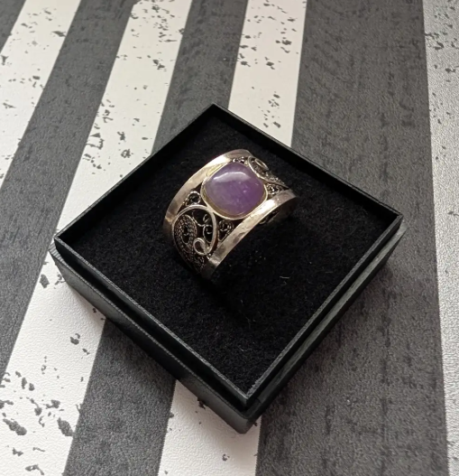 Handmade fine silver (999) filigree ring with semi-precious stone amethyst
